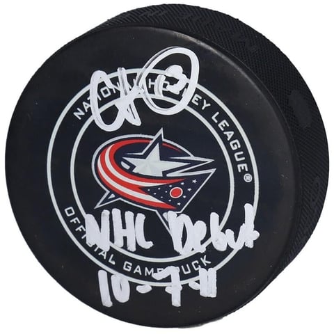Autographed Columbus Blue Jackets Cam Atkinson Game Puck with " Debut 10/7/11" Inscription